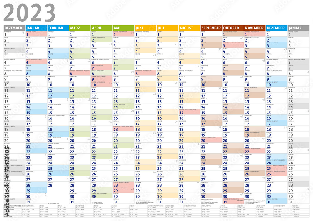Kalender 2023 (Dezember 2022 bis Januar 2024) mit Ferien Stock